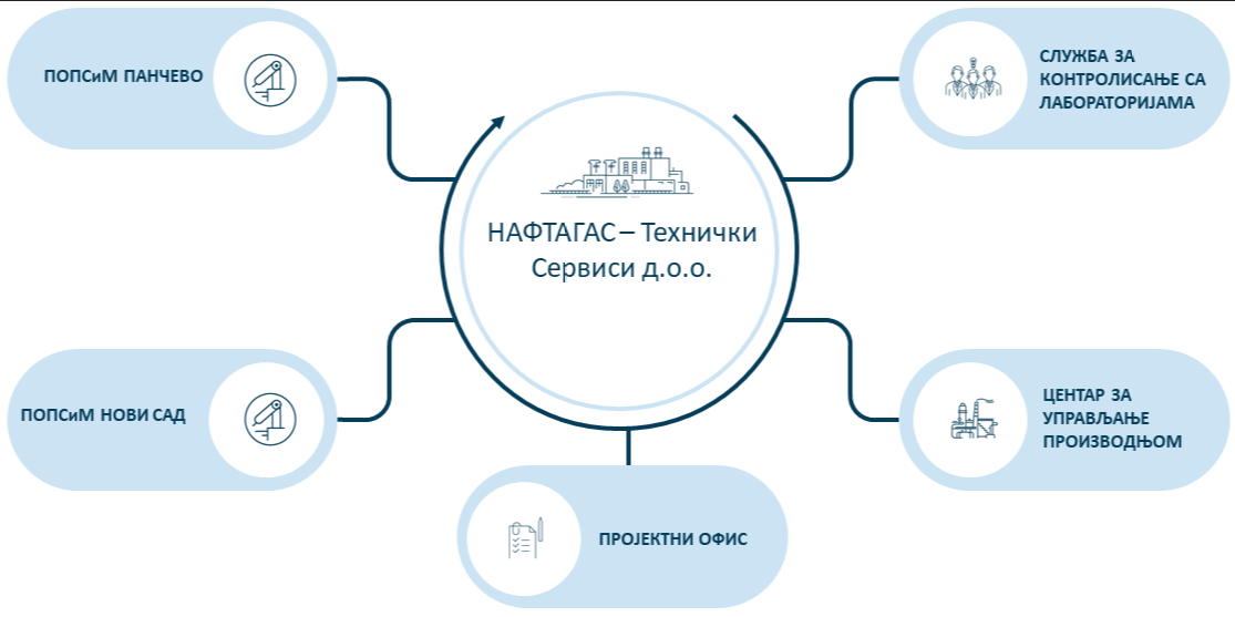 Организациона структура Компанију НАФТАГАС - Технички Сервиси чине Центар за управљање производњом, два Погона за одржавање процесних система и манипулације (ПОПСиМ), Служба за контролисање са лабораторијама, као и Пројектни офис.